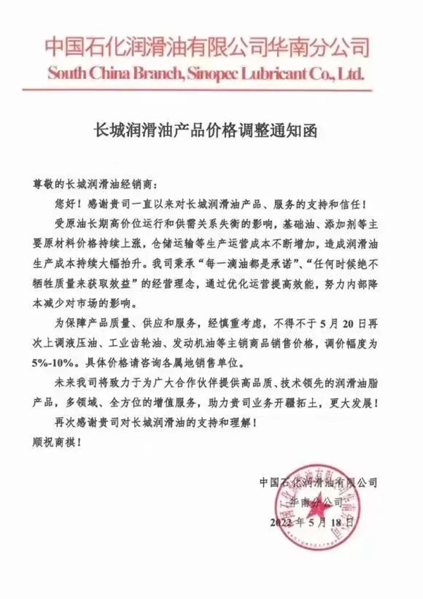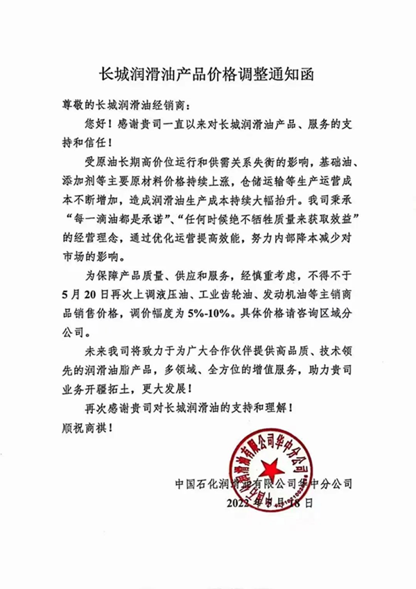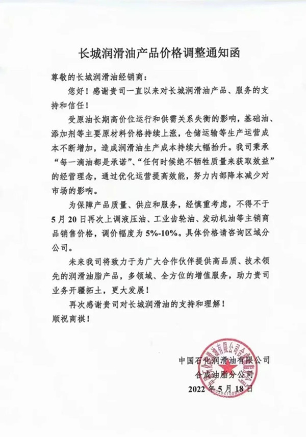 附:長(zhǎng)城潤(rùn)滑油脂漲價(jià)函